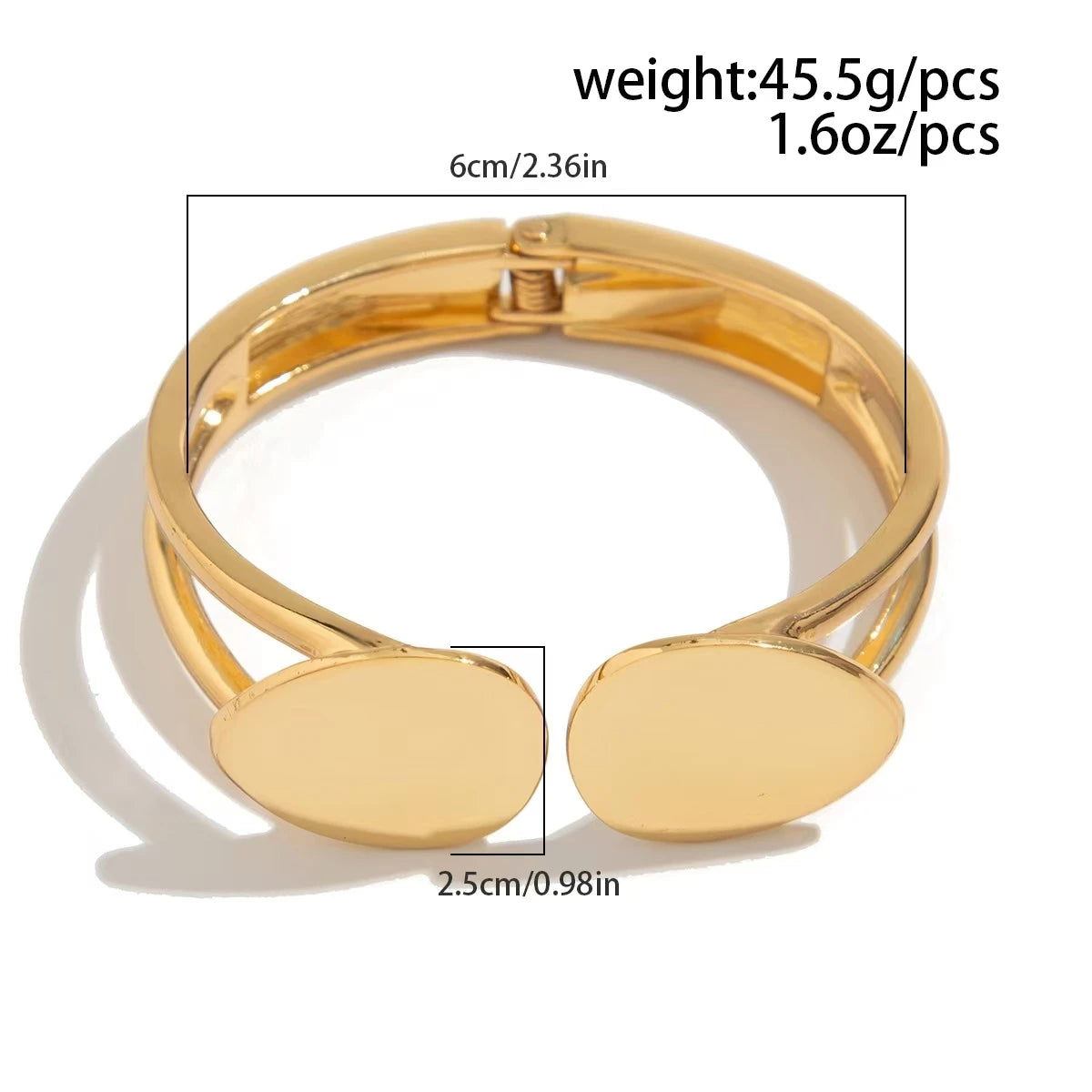 The Monroe Clasp bracelet features a gold tone clasp and a distinctive circle detail, expertly designed to add a sophisticated edge to your jewelry collection. Its sleek and versatile silhouette makes it perfect for stacking with other bangles or wearing solo as a statement piece.